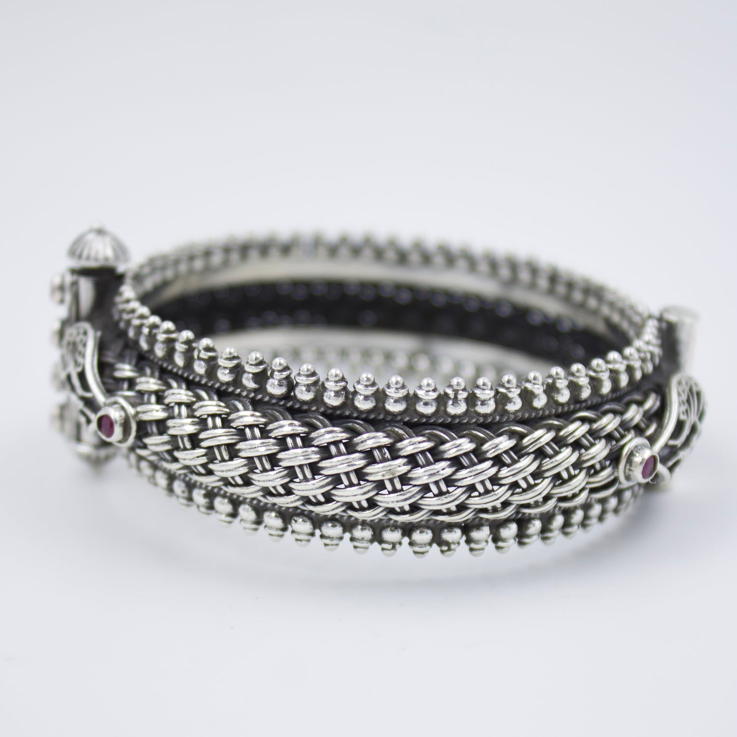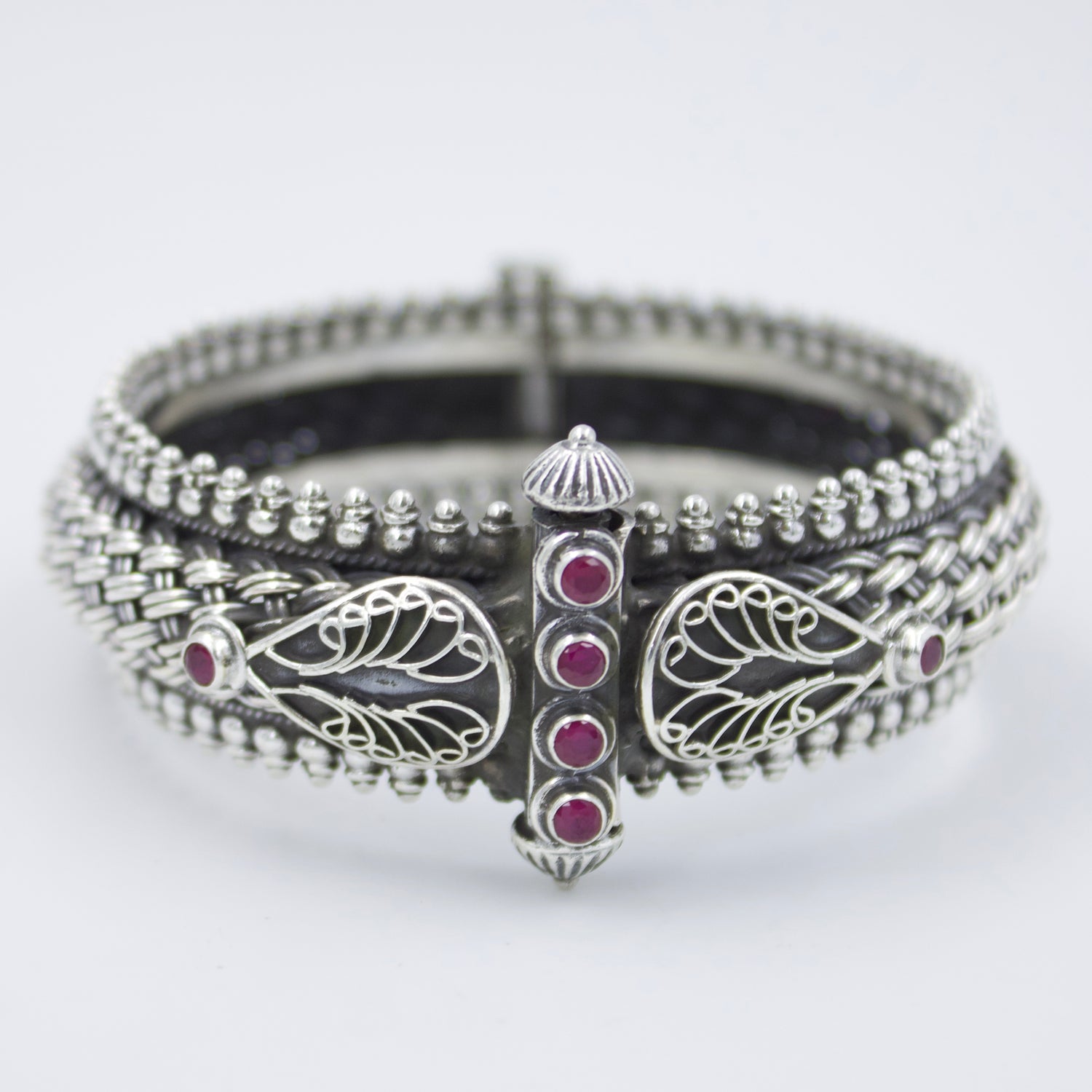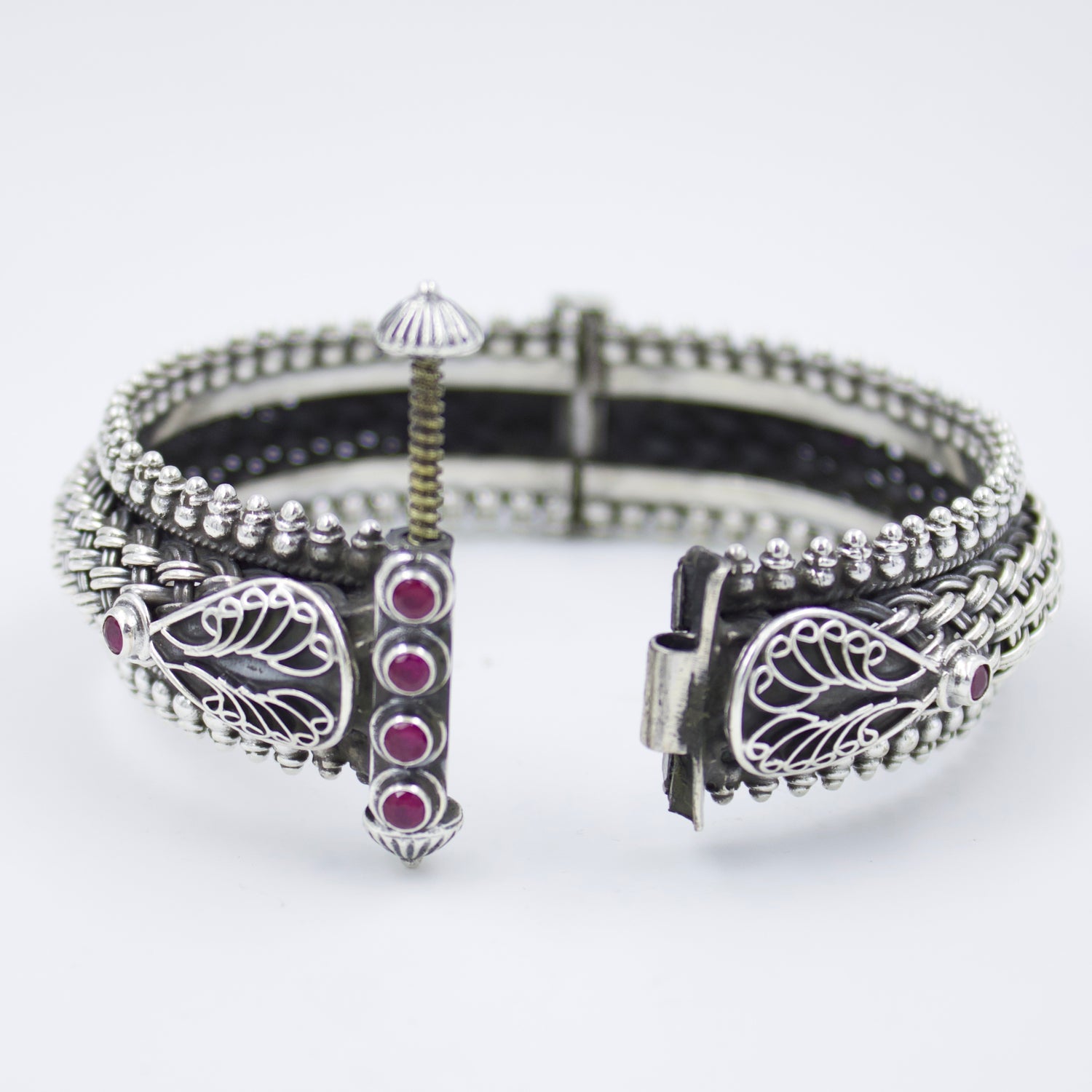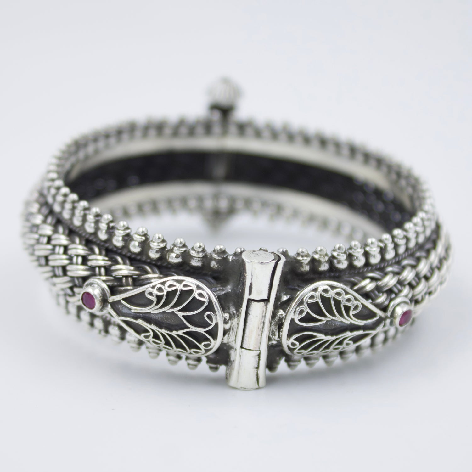 Hand Woven Meshwork Hinged Tribal Statement Kada Bangle with Created Ruby in Sterling Silver
