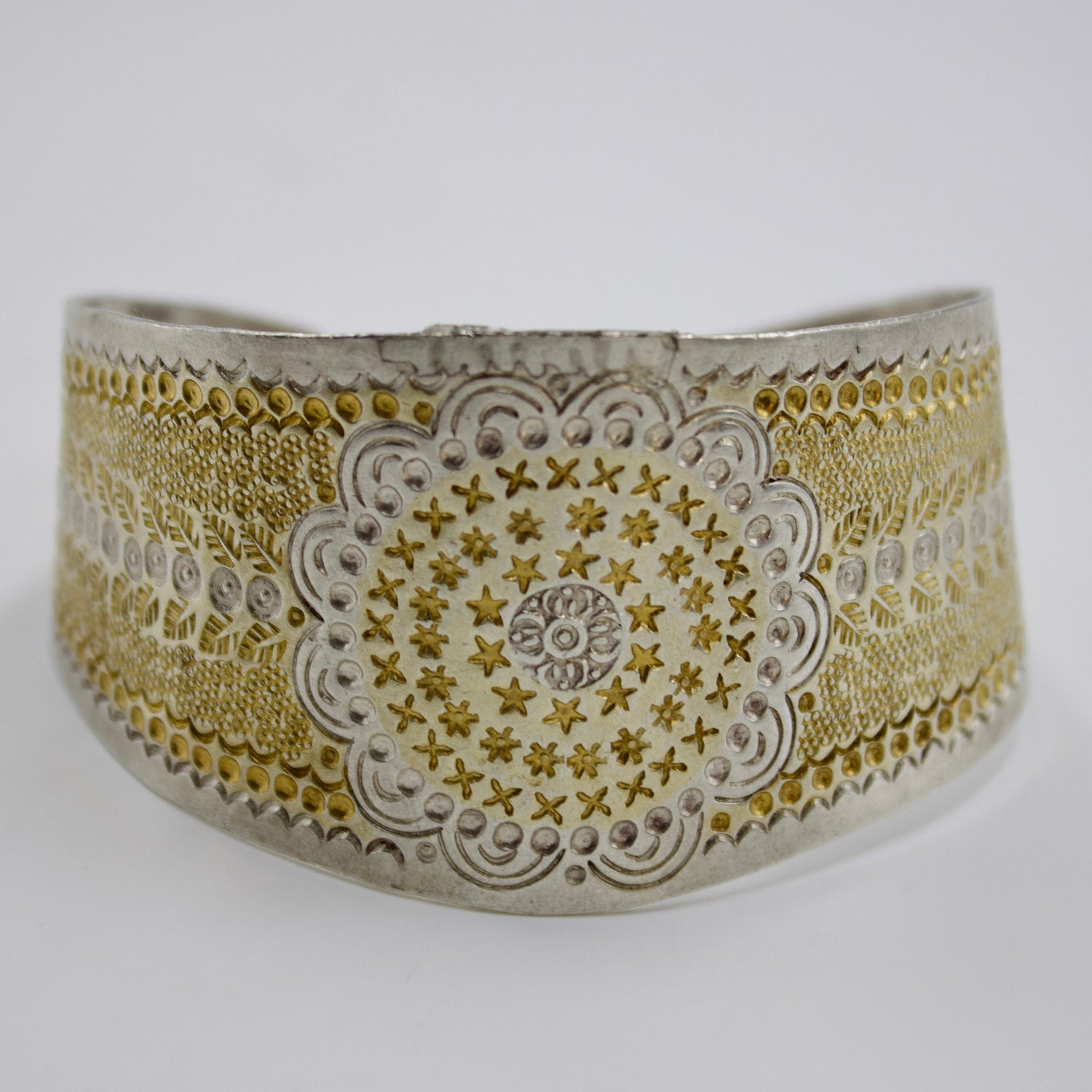 Handmade Dual Tone Gold and Silver Etched Statement Cuff Bracelet in Sterling Silver