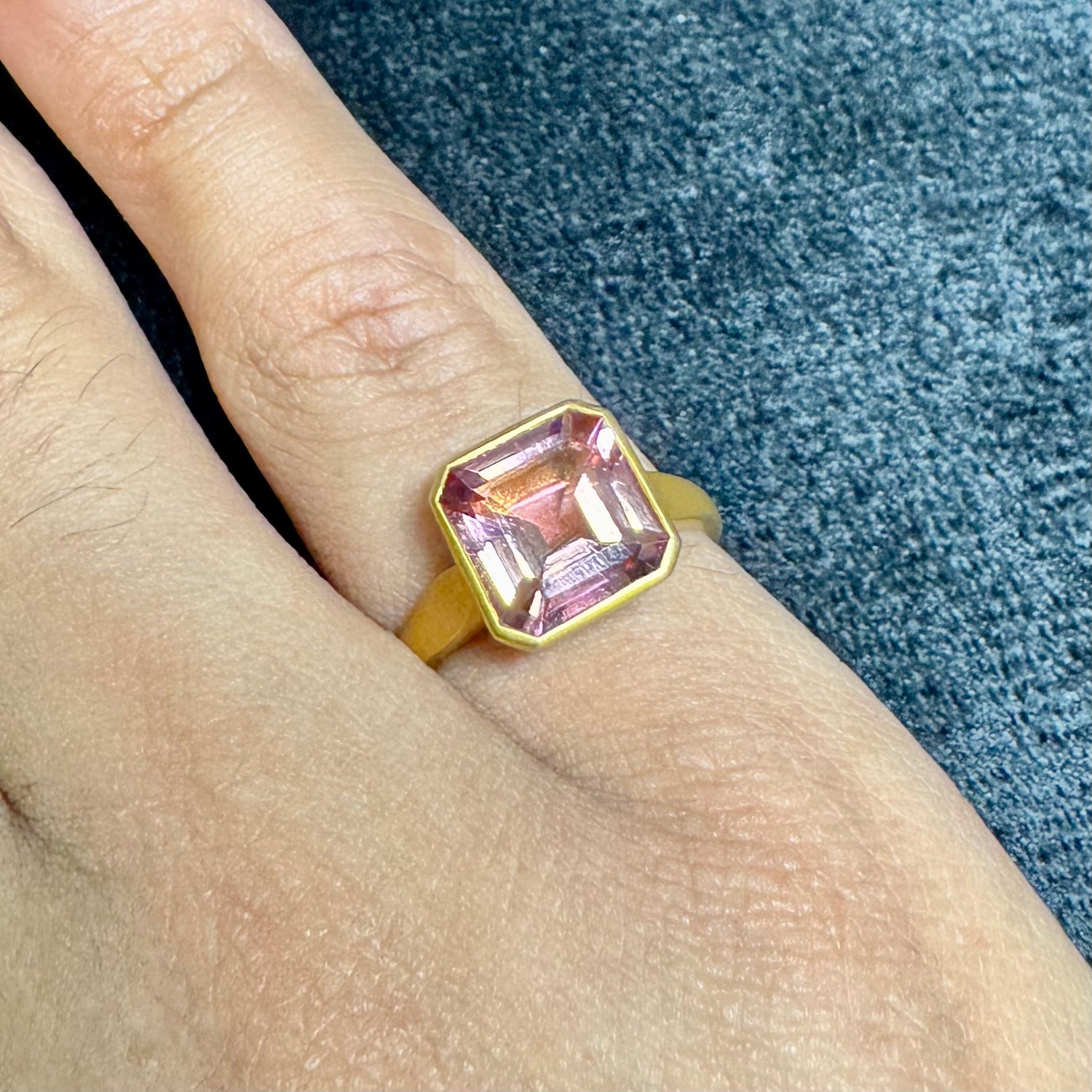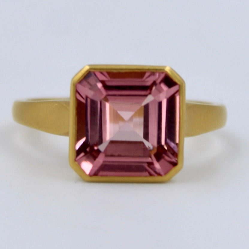 Lustrous 3.1 Ct Asscher Cut Pink Tourmaline Ring in 18K Yellow Brushed Gold Size 7