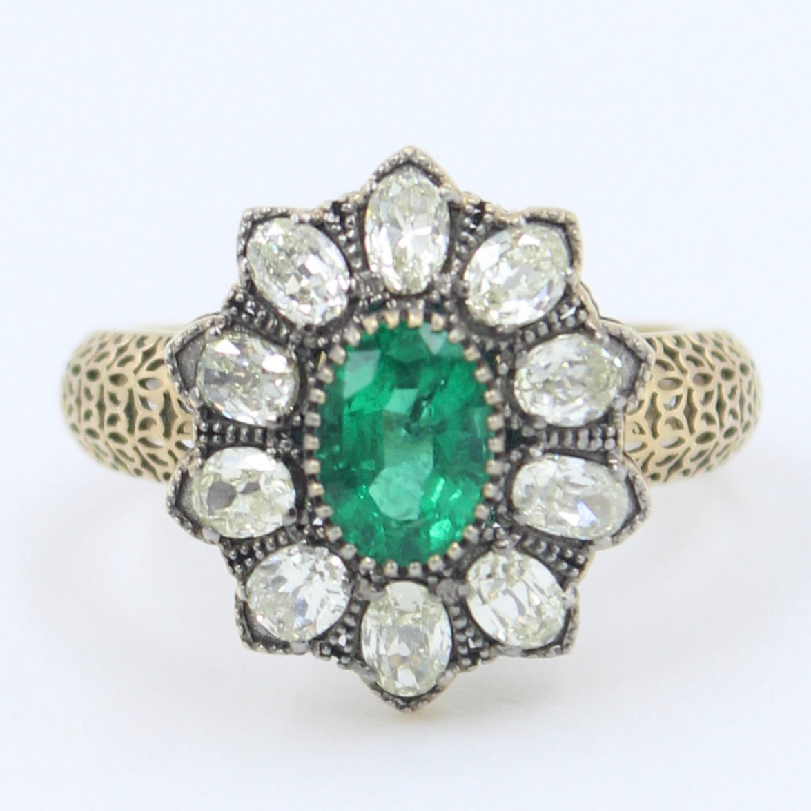 Stones: Natural Zambian Emerald (0.8 ct), Natural Old Mine Cut Oval Diamonds (1.17ct),