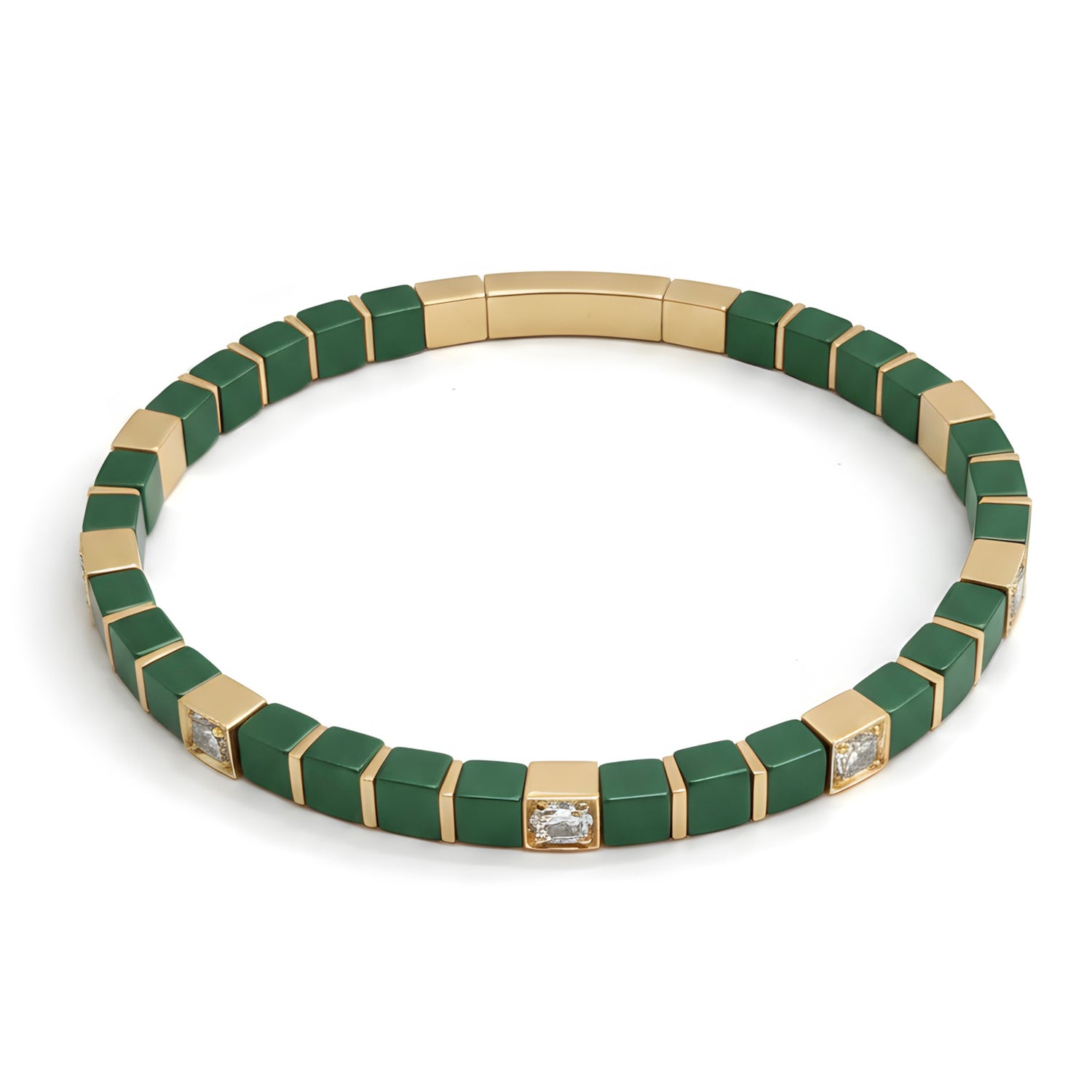 Natural 38.05 Ct Green Onyx & Desert Diamond Tile Beaded Bracelet in 14K Gold