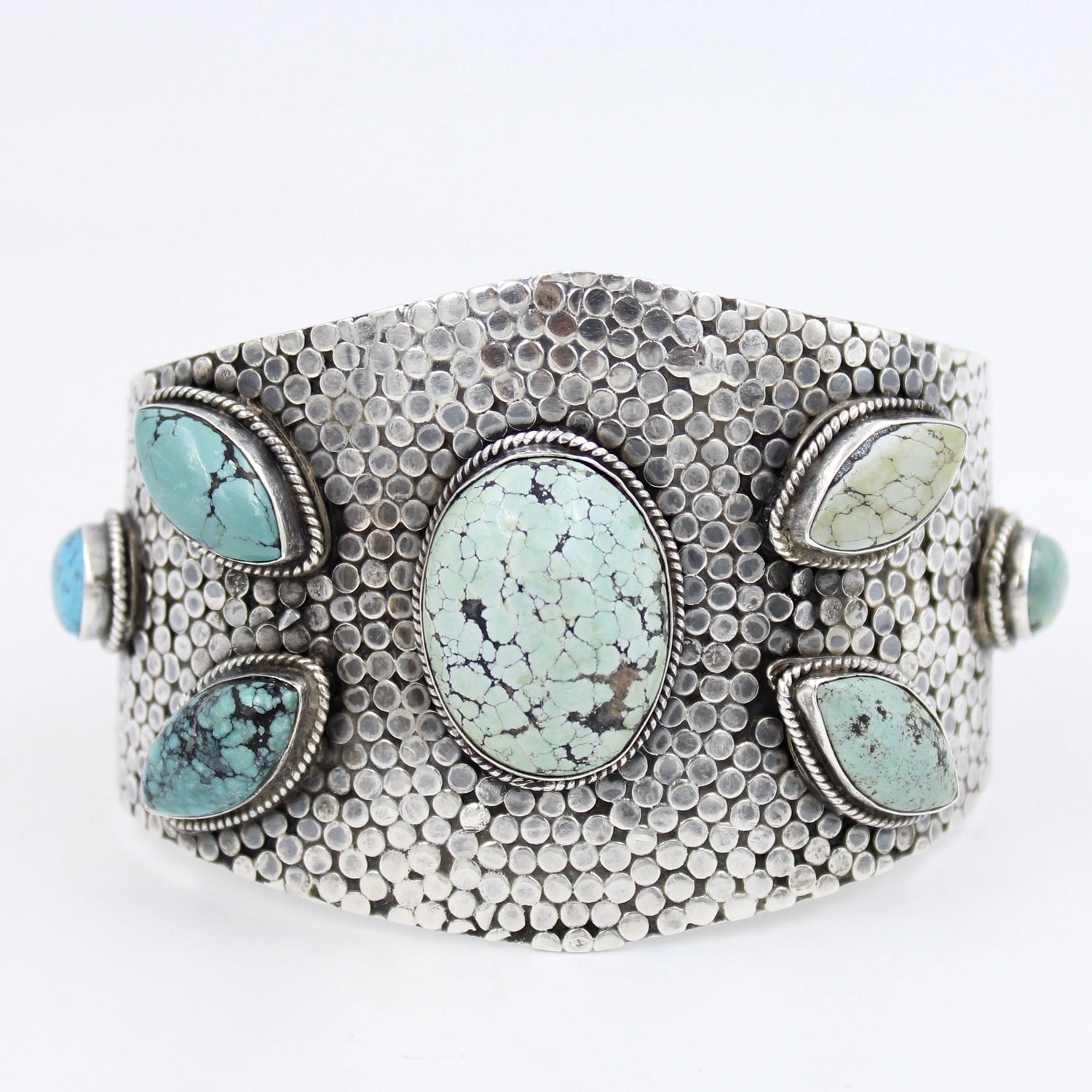 Vintage Handmade Turquoise Broad Statement Cuff Bracelet in Sterling Silver