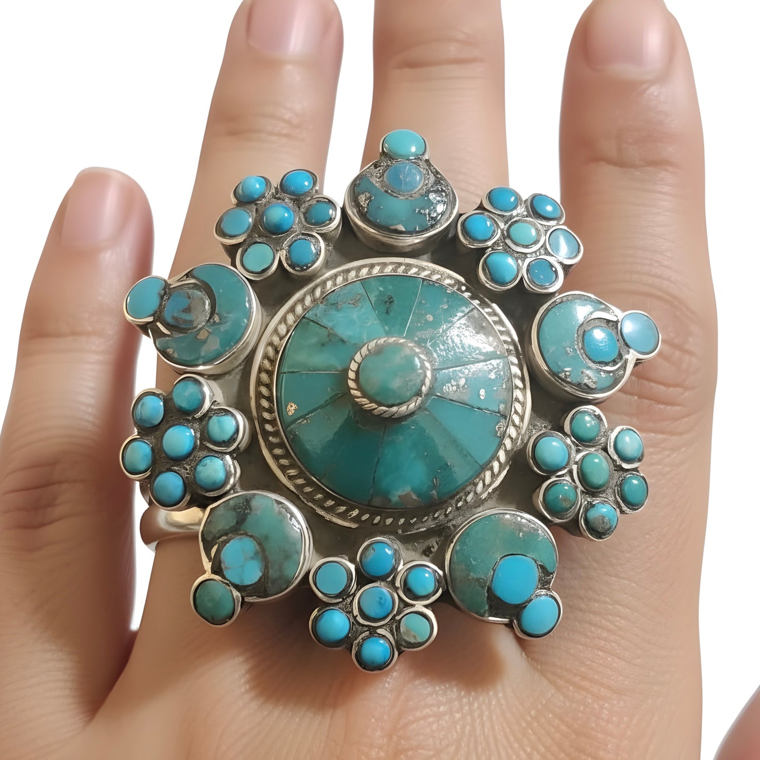 Vintage Tibetan Natural Turquoise Cocktail Ring in Sterling Silver